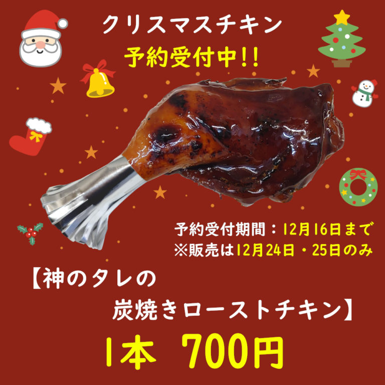 毎年恒例の「クリスマスチキン」と「クリスマスオードブル」のご予約受付中です! 今年は新たに低温調理器を導入したためホロホロの「鶏もも肉のコンフィ」も追加しています! 【神のタレの炭焼きローストチキン】··· 700円 【鶏もも肉のハーブソルトコンフィ】··· 700円 【クリスマ […]