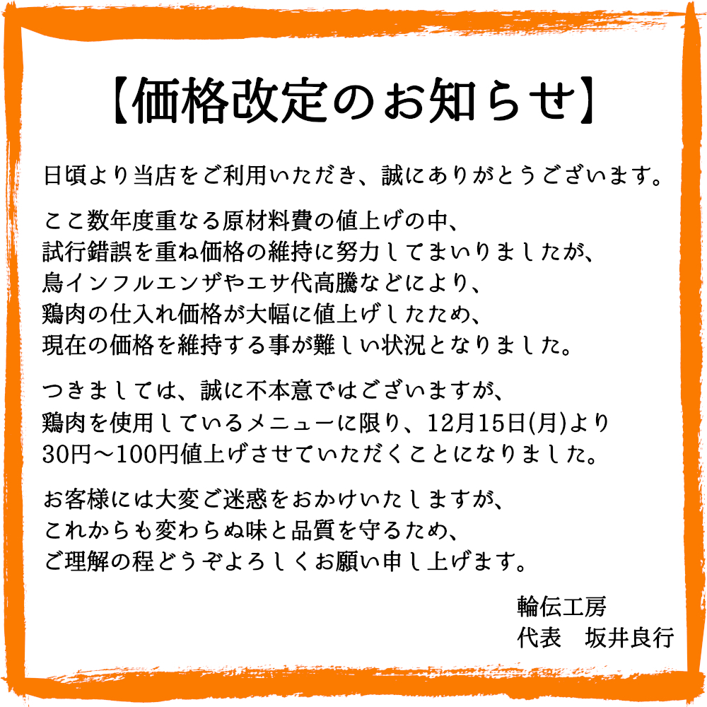 日頃より当店をご利用いただき、誠にありがとうございます。 ここ数年の間に度重なる原材料費の値上げがありましたが、大きな値上げをせず試行錯誤を重ねて今日まで価格を維持してまいりましたが、例年に無いぐらい鶏肉の価格が高騰し続けているため、誠に不本意ではございますが、鶏肉を使用している […]